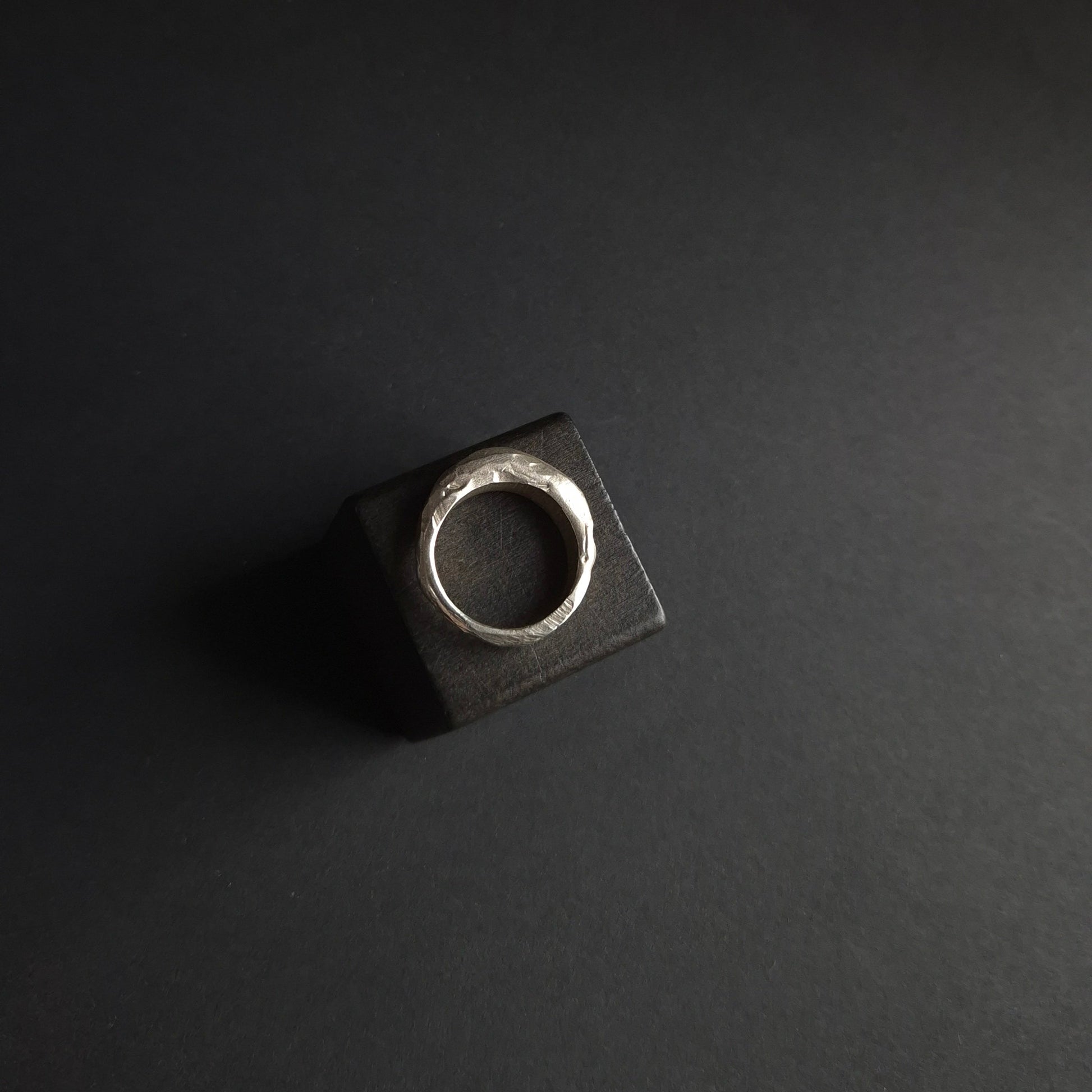This domed signet-style ring in 925 silver is hand-carved, showing file and saw marks, and stamped "925" on the side. Wear it alone, or in a stack as shown here.