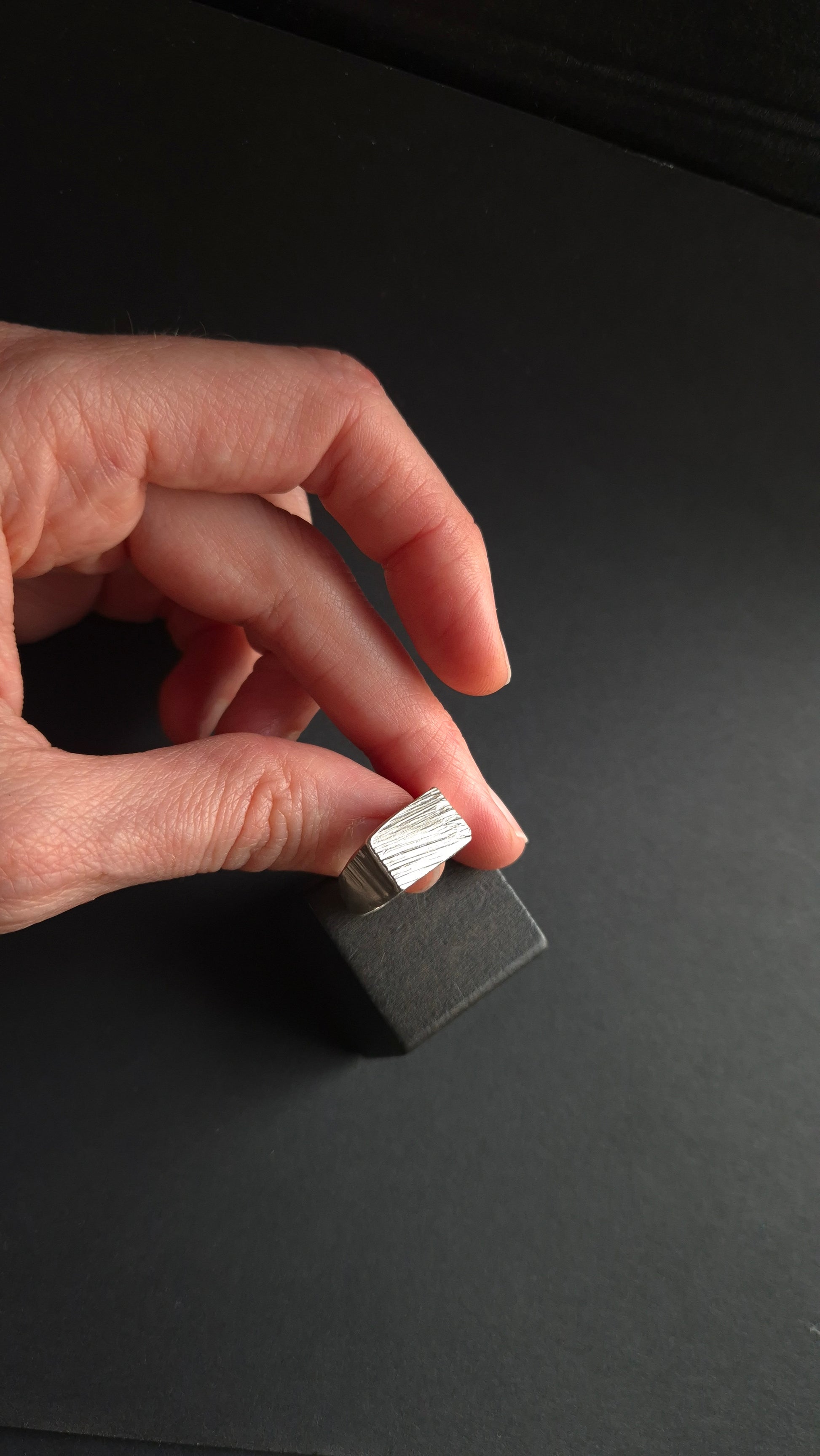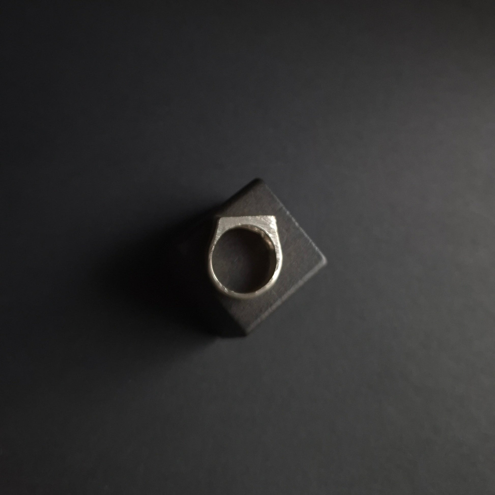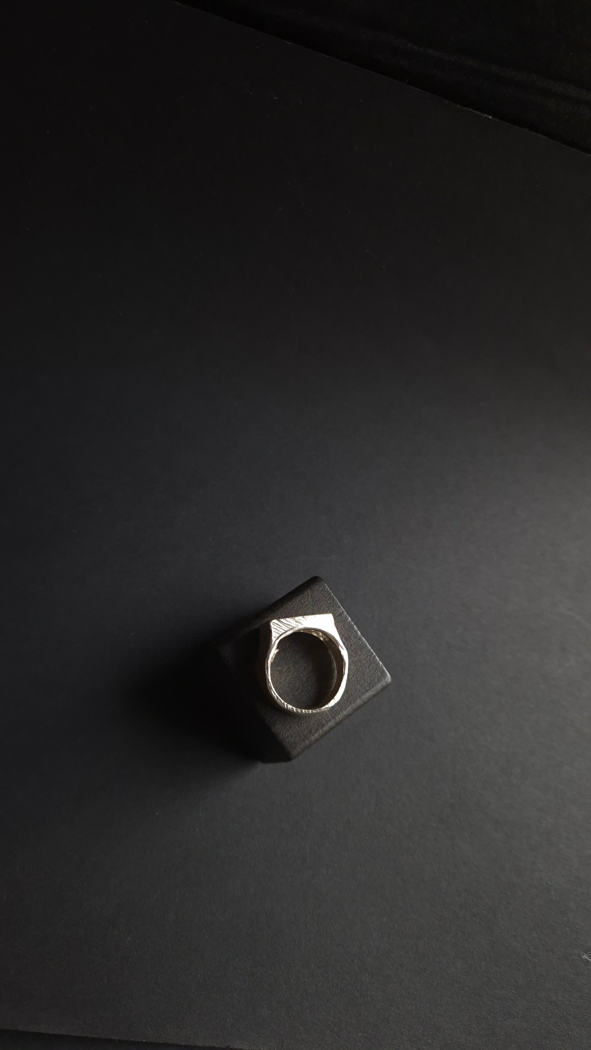 Hand-carved, with a brushed texture and sharp angles, this unique sterling silver signet ring is a freestyle and asymmetric take on a classic.